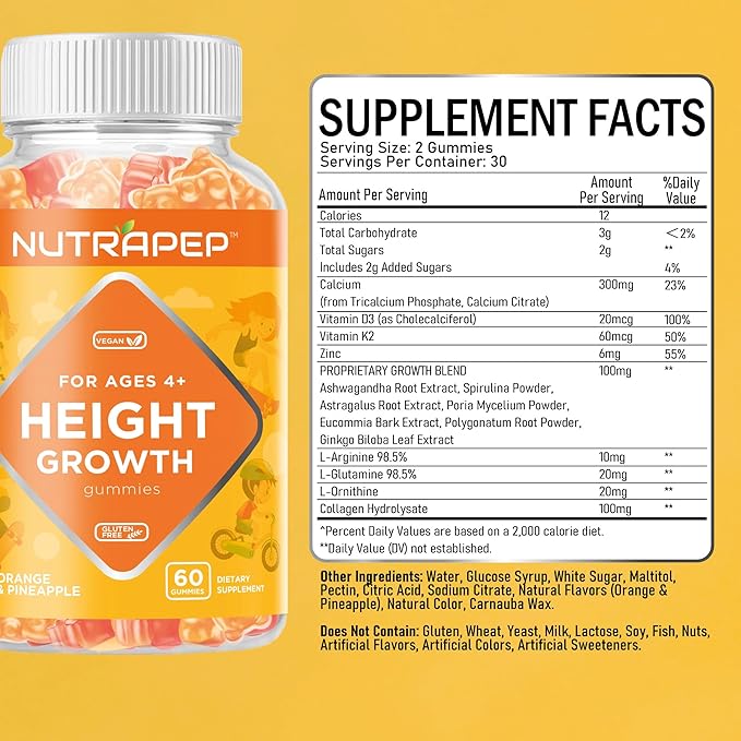 - Deliciously Chewy, Growth Support for Every Kid: Nutrapep Height Growth Support Gummies are designed to please your child's taste buds while delivering essential nutrients for their well-being. Each chewy gummy is enriched with vital vitamins and minerals to keep kids nourished and energized during their growth phase. With a delightful pineapple and orange flavor, these gummies make healthy support both tasty and fun.