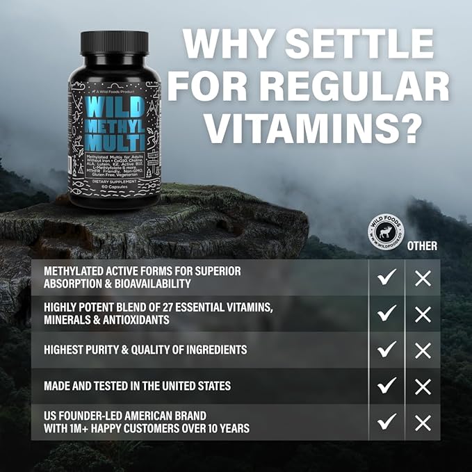 Wild Methylated Multivitamin for Women & Men | Daily Multi Vitamin | MTHFR Supplement Without Iron | Methylated B12, Folate, Vitamin C, A, K2, D, E, Choline, Biotin, ALA, CoQ10 & More (Pack of Two)