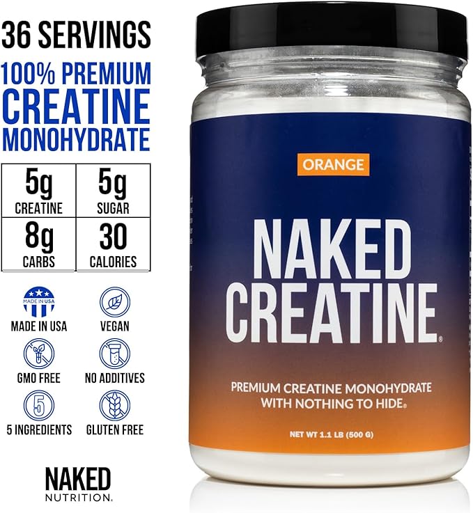 Naked Pure Micronized Orange Creatine Monohydrate - 36 Servings - 500 Grams, 1.1Lb Bulk, Vegan, Non-GMO, Gluten Free, Soy Free. Aid Strength Gains, No Artificial Ingredients Creatine