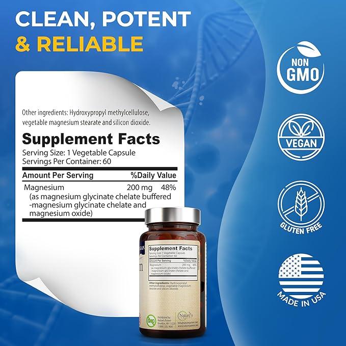 Nature's Potent Magnesium Glycinate 200mg, (High Absorption) Vegan Magnesium Glycinate Capsules Supplement for Women & Men - Chelated Magnesium Glycinate for Sleep - Magnesium for Muscle Cramps - 60ct
