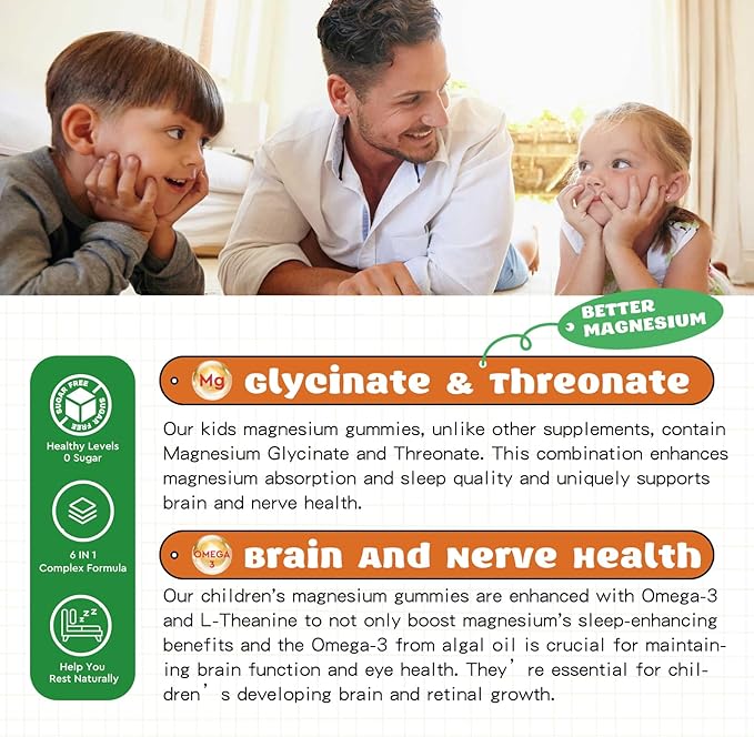 - THE IMPORTANCE OF MAGNESIUM: Magnesium is a vital mineral with over 300 health benefits. Our formula combines magnesium glycinate and threonate to promote brain health, stress relief, and improved sleep quality without the risk of drowsiness or diarrhea. Experience superior absorption and maximum benefits with our advanced magnesium blend designed to meet your child's needs