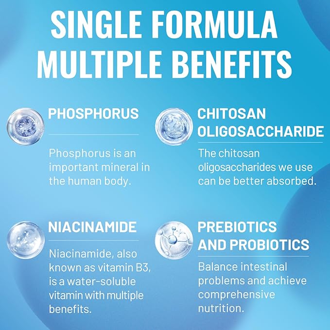 - SUPERIOR PHOSPHORUS MANAGEMENT: Achieve effective phosphorus control with our supplement, containing 600 mg of Niacinamide and 300 mg of premium Chitosan Oligosaccharides. Scientifically crafted, these capsules provide a straightforward solution for balanced phosphorus levels.