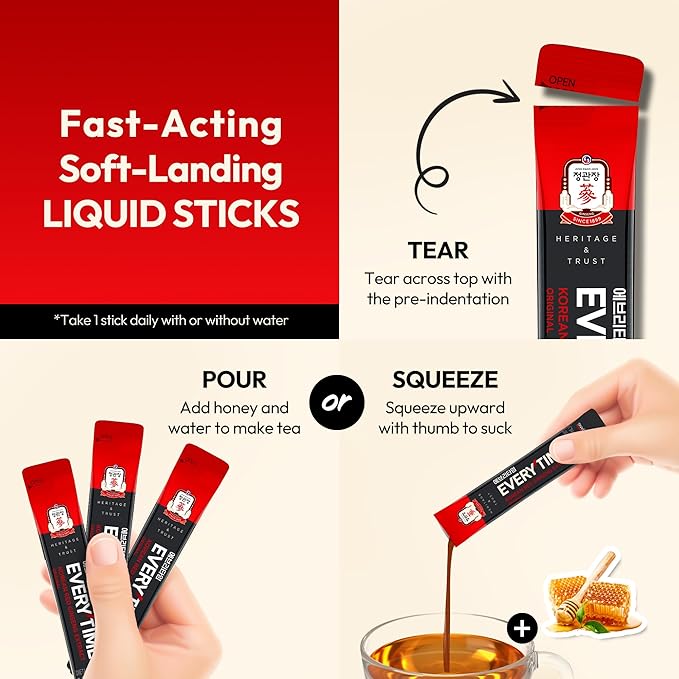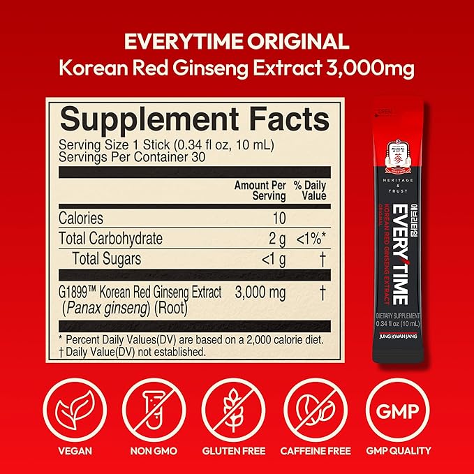 - PORTABLE & GREAT FOR PICK ME UP. Brain fog? Fatigue? Fight fatigue and burnout with Everytime! Each red ginseng liquid stick is compact and perfect for your on-the-go lifestyle. Whether at work, the gym, or traveling, this Korean ginseng supplement is effortless to take anywhere! Each 0.34 fl oz (10ml) stick delivers a convenient 1-tablespoon serving—just one a day keeps it simple!