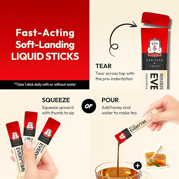 - PORTABLE & GREAT FOR PICK ME UP. Feeling drained? Get the boost without the crash with Everytime! Each compact red ginseng liquid stick fits effortlessly into your routine—whether you're at work, hitting the gym, or traveling. Each 0.34 fl oz (10ml) stick delivers a convenient 1-tablespoon serving—just one a day for an easy boost, where great taste meets function!
