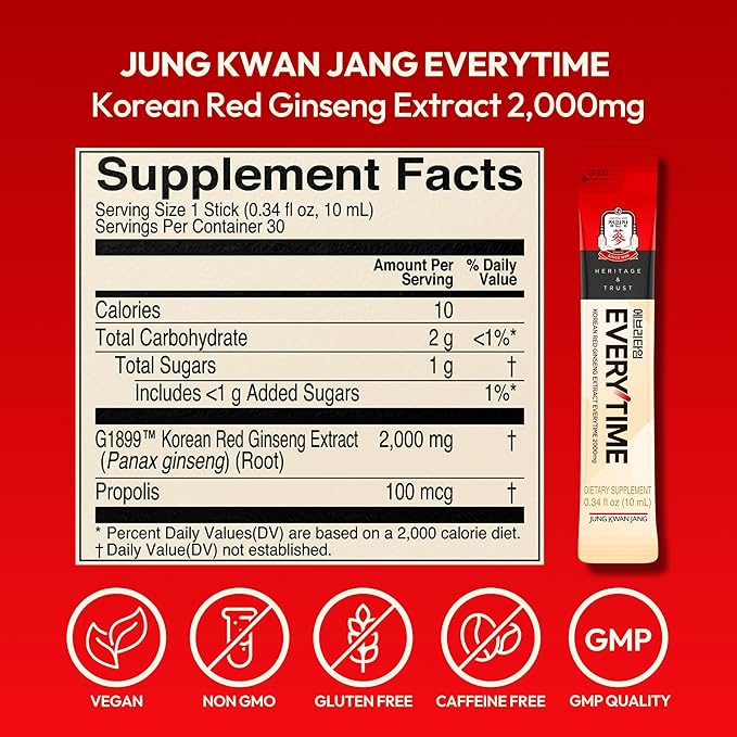 Everytime Korean Red Ginseng Extract 2,000mg - Adaptogen Energy Drink, Liquid Stick Supplements with Propolis - Energy Boost & Immune Support, Caffeine Free (30 Sticks, 0.34 fl oz)