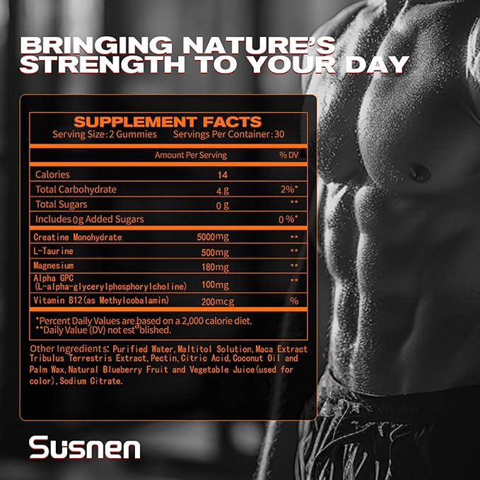 - Enhanced Muscle Performance & Energy Boost: Elevate your fitness routine with our Creatine Monohydrate Gummies, formulated to improve muscle strength, enhance recovery, and boost endurance. The addition of L-Taurine and Vitamin B12 supports sustained energy levels and overall performance.