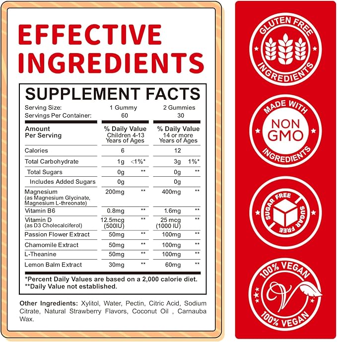 - Sugar Free, Pure & Delicious: Our Kids Magnesium Gummies are completely sugar-free and easy to chew, with a delicious strawberry flavor that everyone loves. Made from natural ingredients and free from artificial flavors, colors and preservatives, these gummies are vegan, non-GMO, and gluten-free. Provide health and happiness for your child with our delightful magnesium gummies (Ages 4-13 take 1 gummy, Ages 14+ & Adults take 2 gummies daily)!*