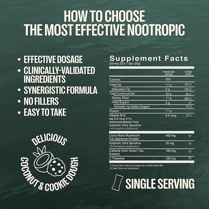 - NOOTROPICS-INFUSED SNACK: Look no further for a boost! Our bars combine Icelandic Ultra Spirulina with clinically tested white-label ingredients like L-Theanine, Lion’s Mane Mushroom, Green Tea Caffeine, and Vitamin B6. Combat fatigue and enhance mental and athletic performance without experiencing a crash later on.