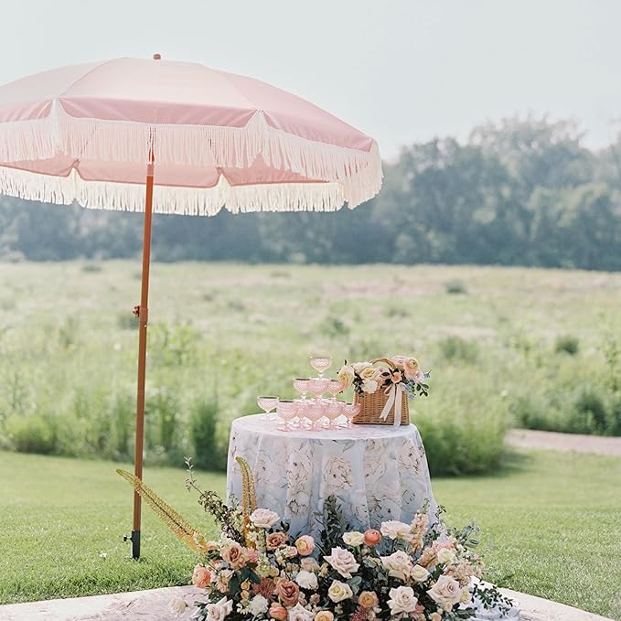 AMMSUN 7ft Patio Umbrella with Fringe Outdoor Tassel Umbrella UPF50+ Premium Steel Pole and Ribs Push Button Tilt, Elegant Pink