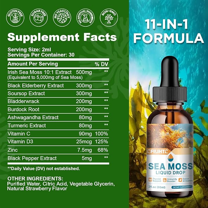 - SEA MOSS LIQUID DROPS 5000mg: CFILIHTC's high absorption sea moss drops for overall health, well-being & nutrients metabolism! Additional herbal ingredients such as soursop extract can support various aspects of health, from immune function to overall wellness, promoting healthy skin and hair, and providing potent antioxidant properties