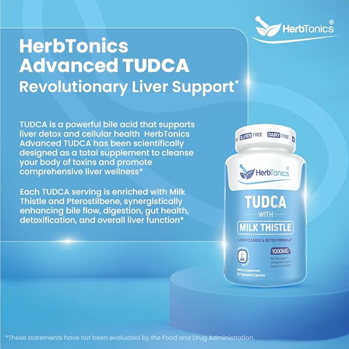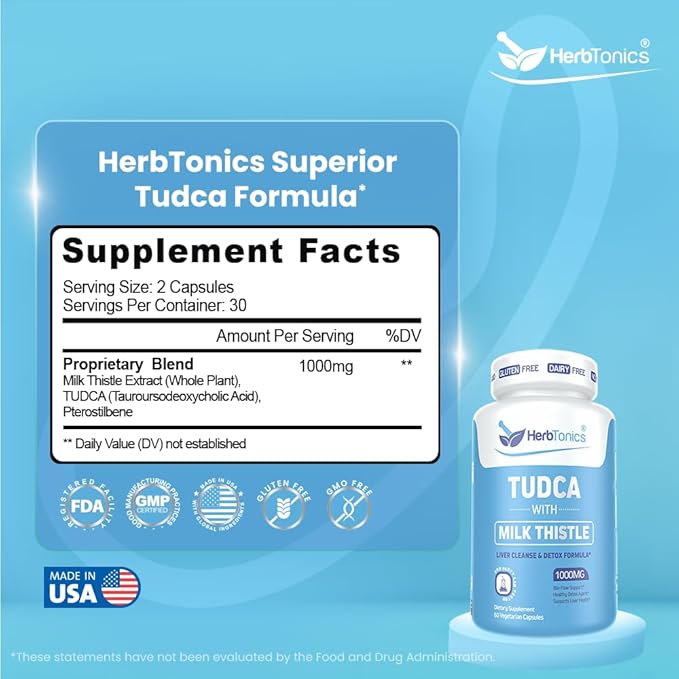 - TUDCA 1000mg Advanced Proprietary Blend: Experience the power of our potent Tudca 1000mg proprietary blend, combining Tudca, Milk Thistle, and Pterostilbene. Herbtonics leads the way in advanced liver cleanse, detox & repair offering a customized formula for best results.