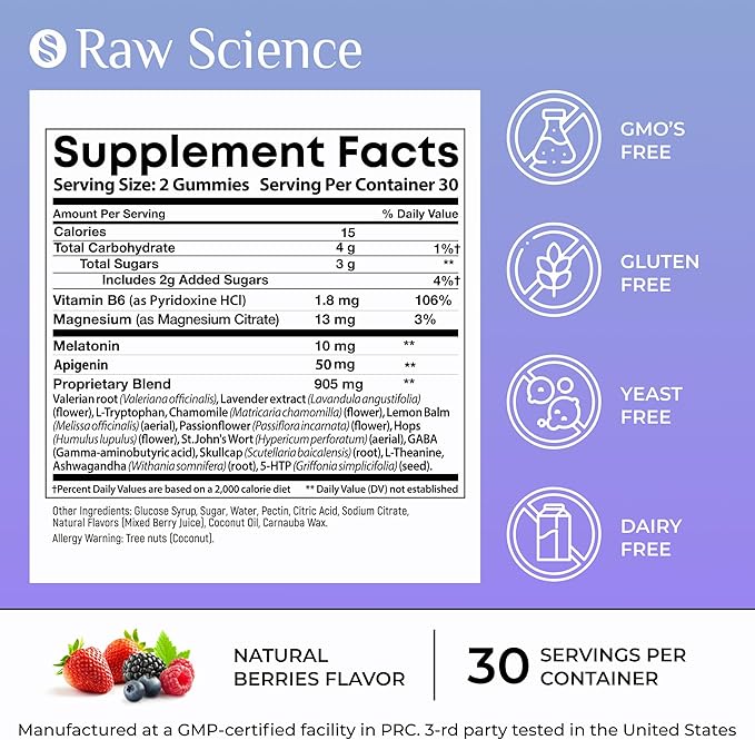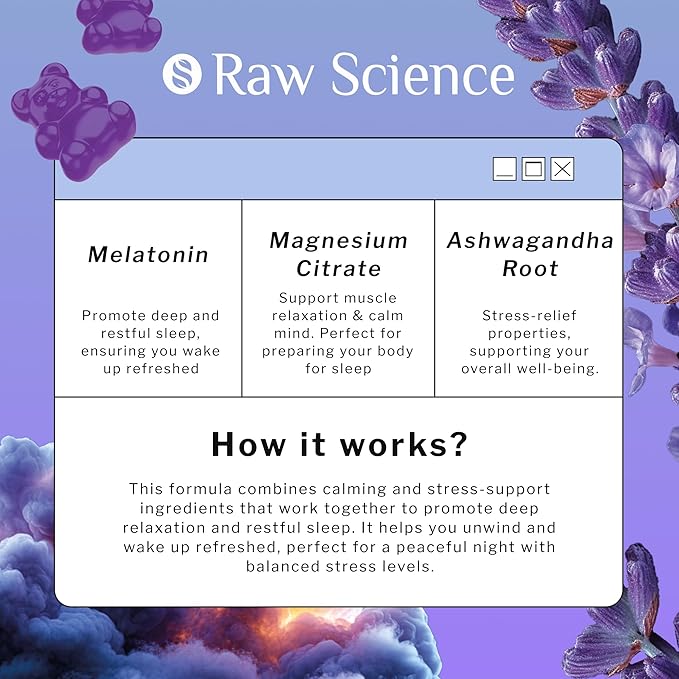 - 【CALMING GUMMIES FOR ADULTS】 — Find your calm with Raw Science Gummies designed to ease stress and promote relaxation. Enriched with B6 Vitamins, Taurine Supplement, and packed with Ashwagandha, these gummies are a perfect way to unwind and support your well-being.