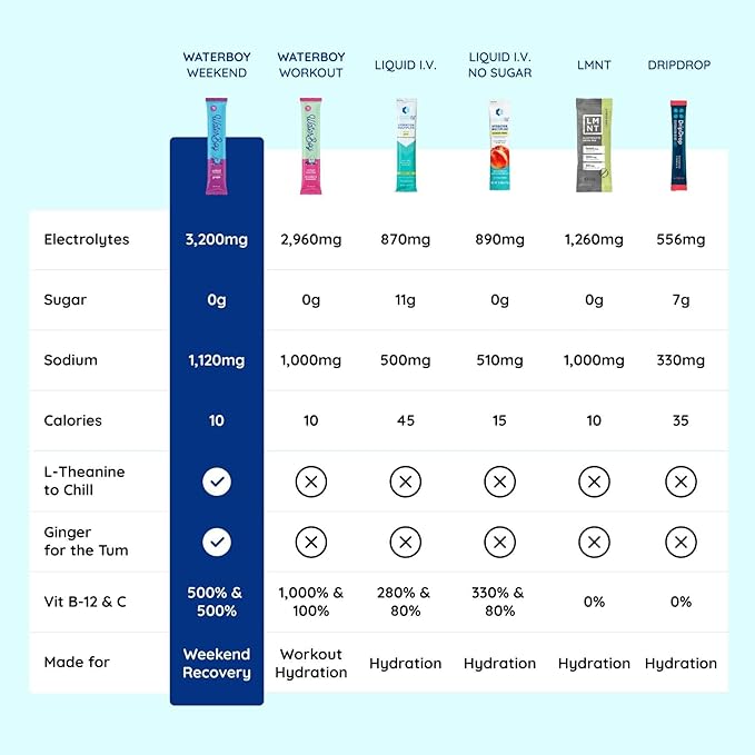 - MADE FOR ADULTS: Most electrolyte mixes and electrolyte drinks on the market are made for kids, general hydration or sports or and are LOADED with sugar. Waterboy weekend recovery is made specifically to help adults. Waterboy includes L-theanine, ginger and vitamins to help you bounce back faster