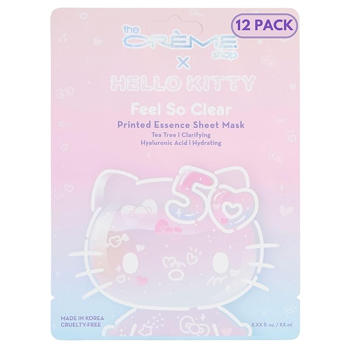 The Crème Shop x Hello Kitty Feel So Clear Printed Essence Sheet Mask, Clarifying and Hydrating Face Mask with Tea Tree and Hyaluronic Acid - 50th Year Anniversary Limited Edition - (Pack of 12)