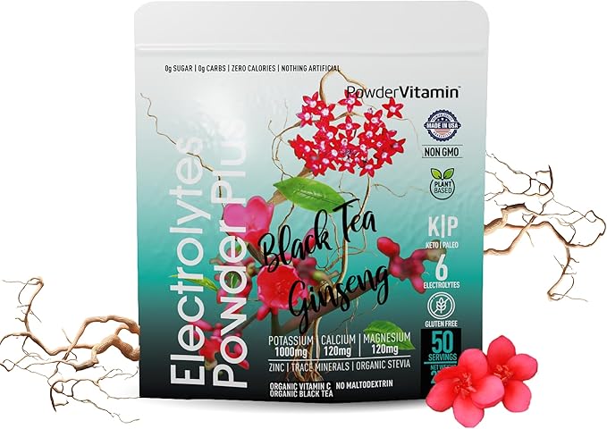 Electrolytes Powder Plus (50 Servings) Black Tea Ginseng Electrolyte Powder Keto, Sugar Free, Pink Himalayan Salt,1000mg Potassium,120mg Calcium,120mg Magnesium, Hydration Powder