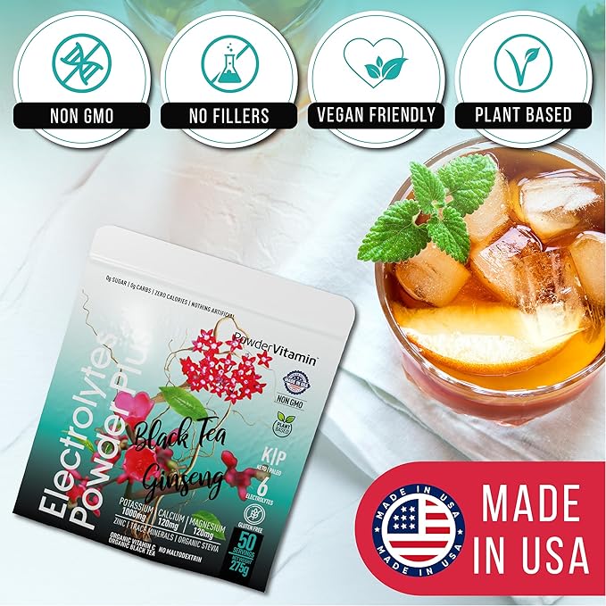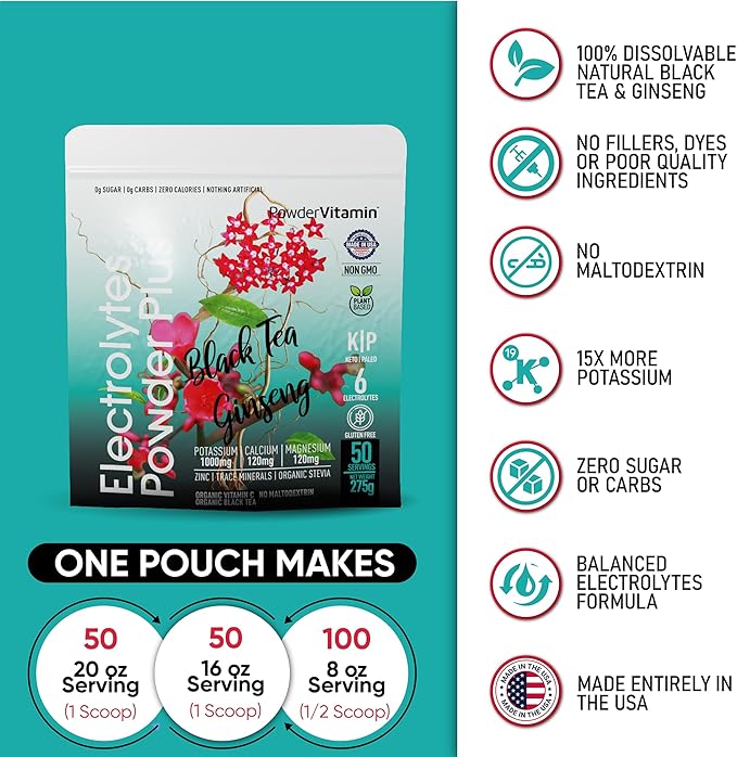 - Easy To Make: By stirring into flat or sparkling water, our sugar-free electrolytes powder serves up 50 20oz of refreshing keto Black tea ginseng per 275g pouch. It is a thirst-quenching recovery drink.