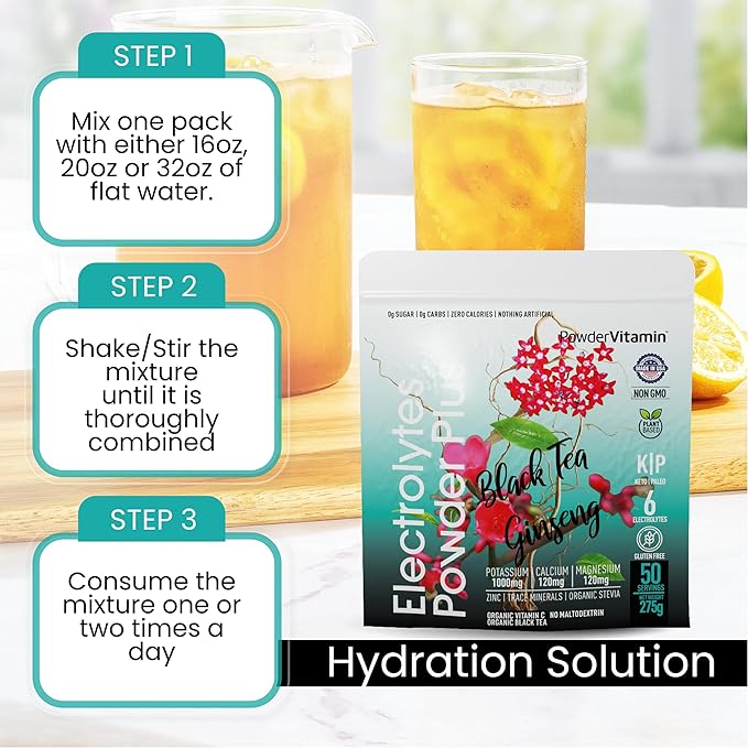 - Electrolyte Water Enhancer: Packs 1000mg potassium, 120mg calcium, 120mg magnesium, organic black tea,organic ginseng and organic Vitamin C + zinc into an energy-boosting, hydration drink mix with zero calories or sugar.