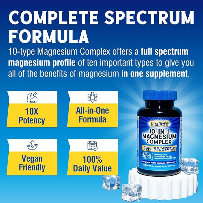 - Supports Total Body Health*: Vitalibre 10-in-1 Magnesium Complex delivers a broader range of health benefits to help improve your common everyday health struggles.* Magnesium glycinate complex promotes nerve relaxation for tranquil sleep and brain health, supports healthy muscle cramps for improved exercise performance & heart health, and maintains a strong immune and digestion system.*