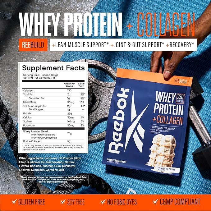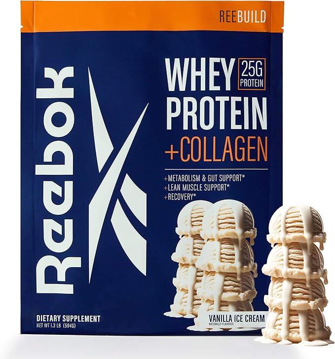 Reebok ReeBuild Whey Protein + Collagen | 25g Protein, 9 Essential Amino Acids | Muscle Growth, Joint Health, Gut Support | Post Workout Recovery Powder | Vanilla Ice Cream