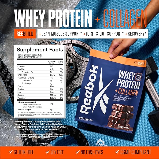 - Rebuild Stronger: For decades, Reebok has been synonymous with athletic strength and resilience, and now [REE]BUILD brings that same heritage to your recovery. Packed with 25g of premium protein from whey isolate, whey concentrate, and collagen peptides, this is more than a supplement—it’s part of the Reebok tradition of building strong, capable bodies. Whether you're focused on post-workout recovery or enhancing muscle growth, [REE]BUILD is designed for athletes who demand the best.
