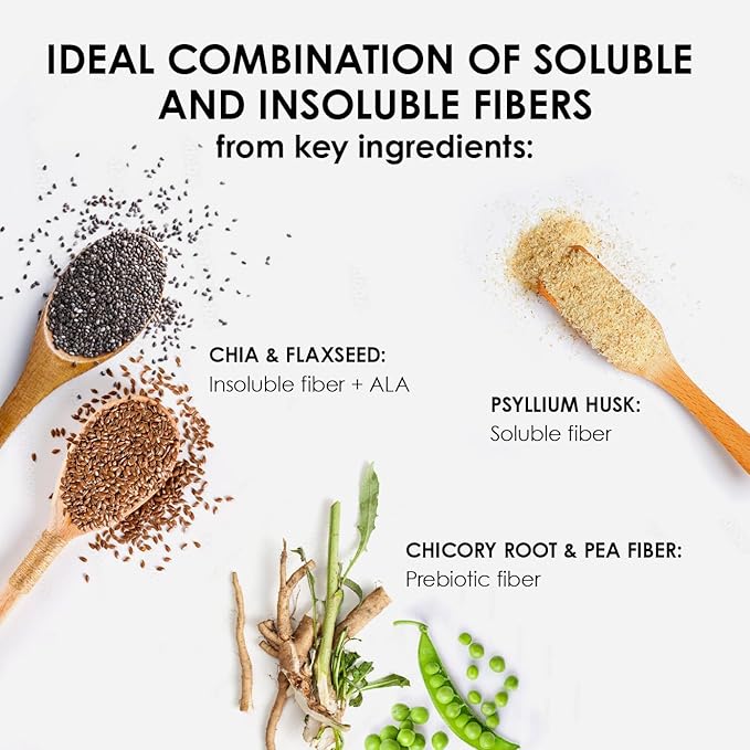 - SUPPORT CARDIOVASCULAR WELLNESS: Combat heart disease risk factors with the soluble fiber in psyllium husk, designed to support heart health when complemented with a low-saturated fat diet. Our formula includes insoluble fiber from chia and flaxseed, which not only provides essential fiber but includes ALA, an omega-3 fatty acid crucial for cardiovascular health and wellness.