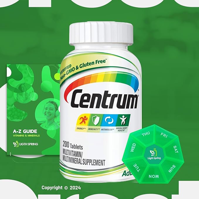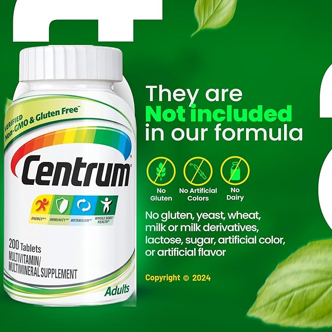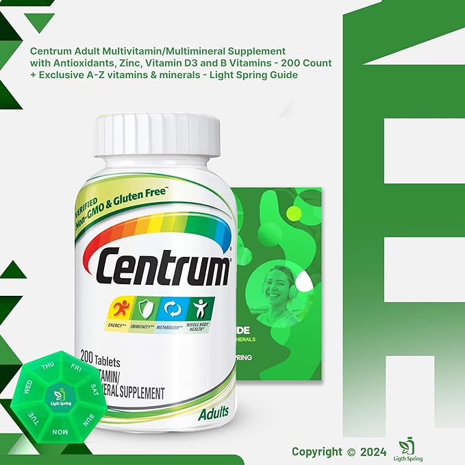 - 200 count bottle of Centrum Adult Multivitamin/Multimineral Supplement with Antioxidants such as Vitamins C and E, and Zinc, Vitamin D3 and B Vitamins.