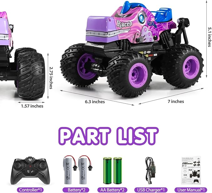 - Long Playing Time - Comes with 2 rechargeable 3.7V 800mah lithium batteries that provide a total of 50 minutes of non-stop racing fun. The package also includes 2 AA batteries for controller so the kids can start to have fun with this rc monster truck right away.