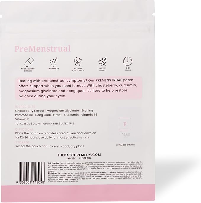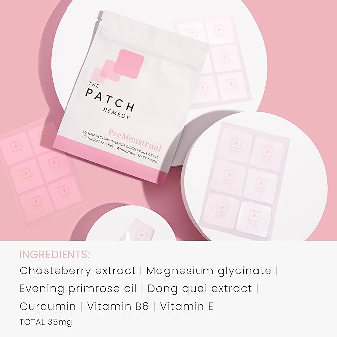 - THE PATCH REMEDY PMS PATCH - Our Pre-Menstrual Patches contain ingredients featuring natural chasteberry and curcumin. Balance out the hormonal roller coaster.