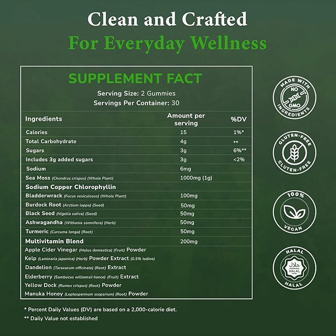 - [Packed with Nutrients] Each serving of our sea moss gummies provides 1500mg of Irish sea moss, along with Bladderwrack, Burdock Root, and Ashwagandha