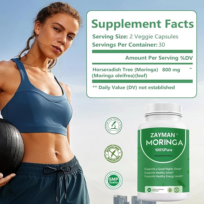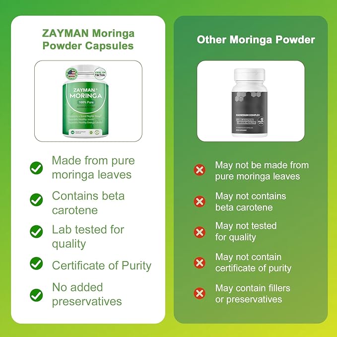 ZAYMAN Moringa Powder Capsules | 800mg of Pure Nutrient Rich Moringa Powder Moringa Supplement | 100% Pure & Natural Superfood, Vegan Greens, Multivitamin - Supports Energy, Skin Health, Gut Health