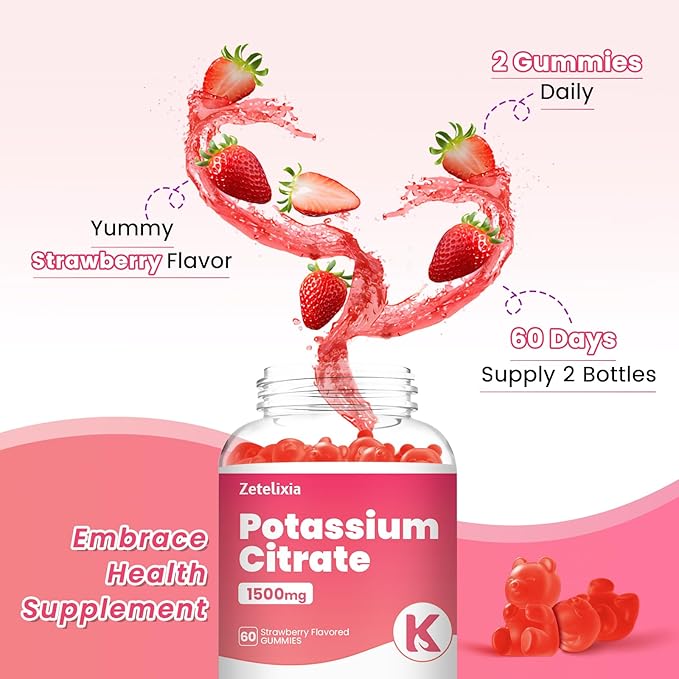 - POTASSIUM SUPPLEMENT 1500MG: Potassium citrate is an essential mineral that plays an important role in a variety of body functions. With limited access to potassium-rich foods in our lives and diets, these potassium supplement gummies offer a convenient and enjoyable solution to help meet daily potassium needs