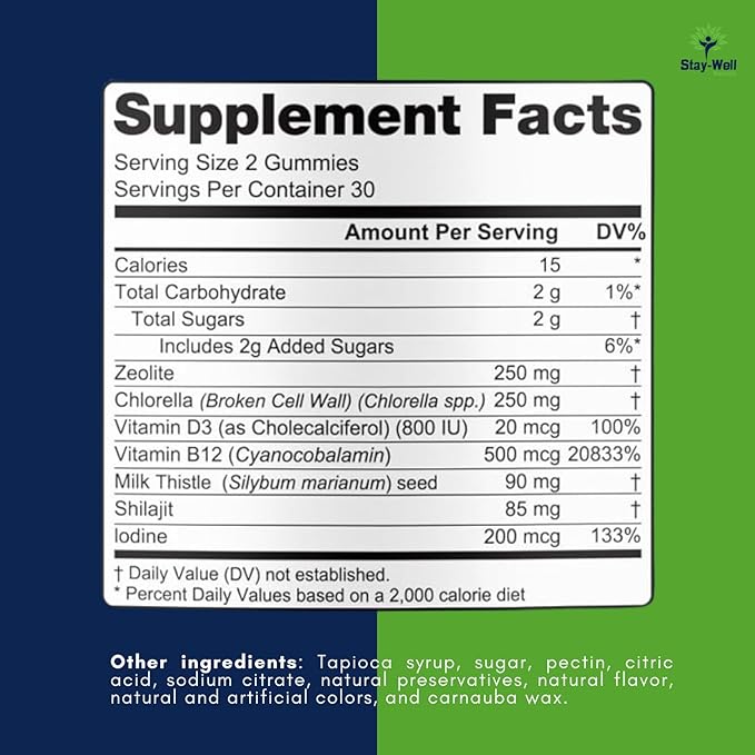 - Special Ingredients : Zeolite, Chlorella Vitamin D and B12, Milk Thistle, Shilajit and Iodine