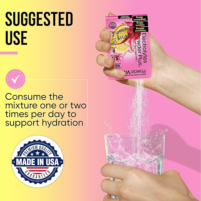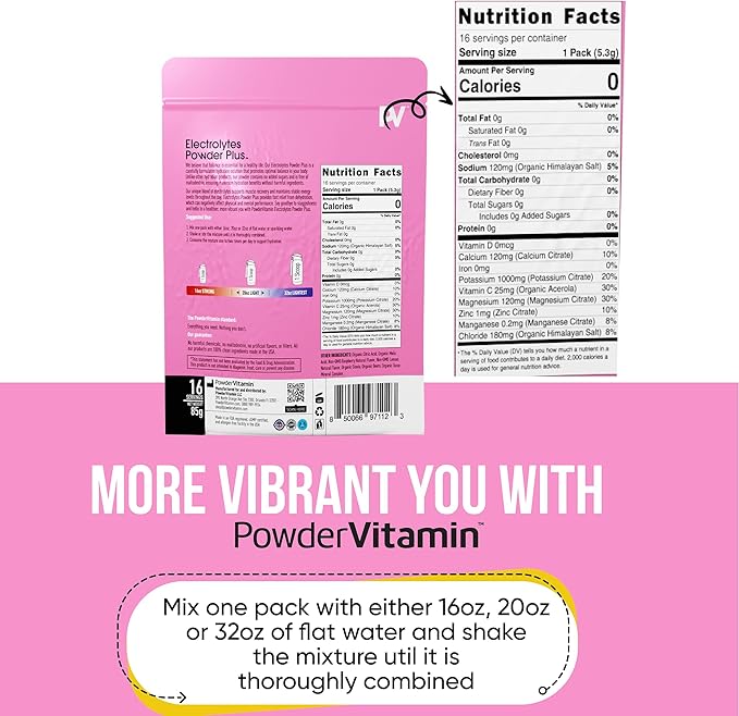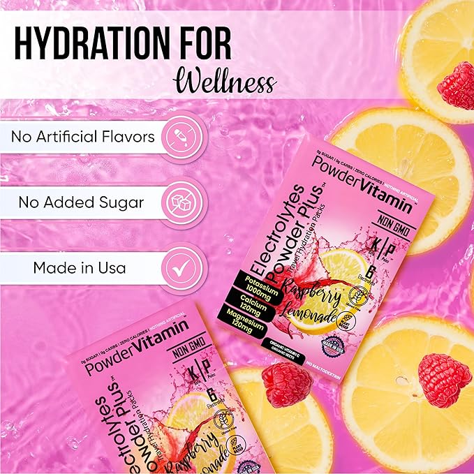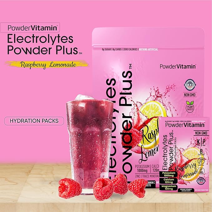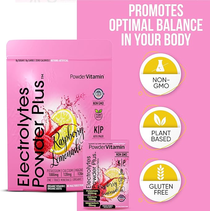 - Electrolyte Powder - Electrolytes Powder Plus contains 1000 mg of potassium opposed to only 250 mg in other brands. Additional we offer a unique flavor and blend of Magnesium, Calcium, Organic Pink Himalayan salt. Our delicious and hydrating blend of Raspberry Lemonade flavor includes 16 hydration packets for exercise, travel, or long nights. PowderVtmain Electrolytes Powder plus travel hydration packets has you covered.
