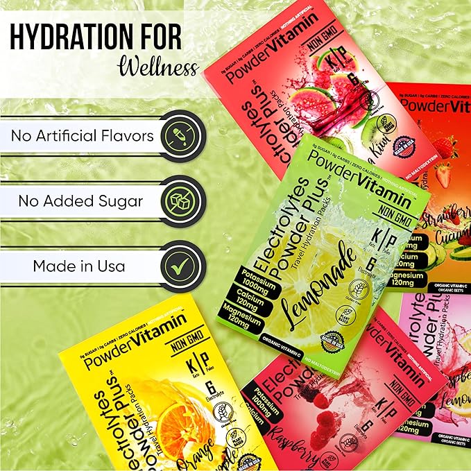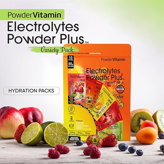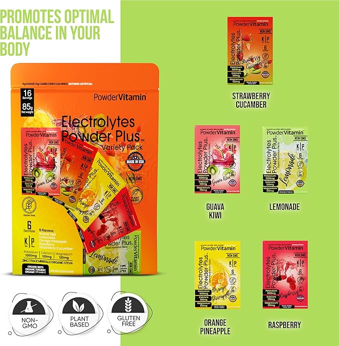 - Electrolyte Powder - Electrolytes Powder Plus contains 1000 mg of potassium opposed to only 250 mg in other brands. Additional we offer a unique flavor and blend of Magnesium, Calcium, Organic Pink Himalayan salt. Our delicious and hydrating blend of Variety Pack A flavor includes 16 hydration packets for exercise, travel, or long nights. PowderVtmain Electrolytes Powder plus travel hydration packets has you covered.