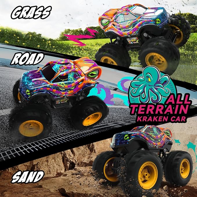 - 【Ocean Predator Design】1:16 scale monster truck features a unique octopus-themed exterior with vibrant colors, igniting boundless imagination in children aged 4-8.