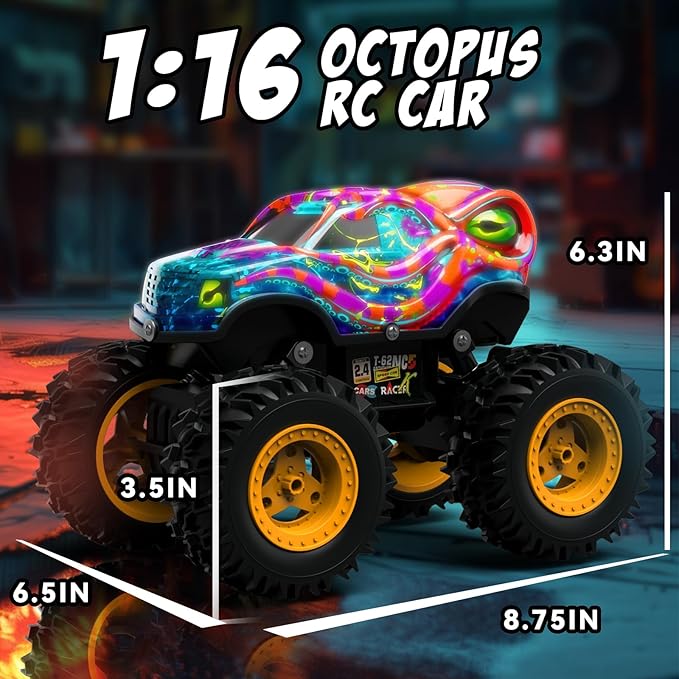 - 【Ocean Predator Design】1:16 scale monster truck features a unique octopus-themed exterior with vibrant colors, igniting boundless imagination in children aged 4-8.