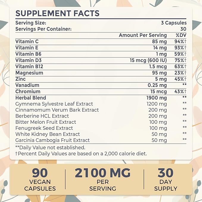- ESSENTIAL VITAMINS & MINERALS: Our Gymnema supplement is fortified with vitamins C, E, B6, D, B12, magnesium, zinc, vanadium and chromium. These essential nutrients have been carefully selected to support overall well-being, aligning with a lifestyle of wellness and vitality