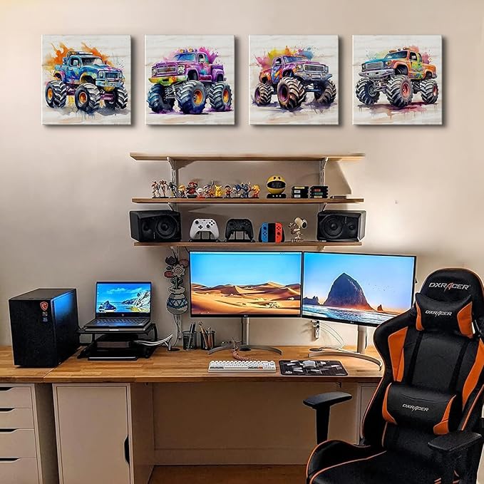 - đăExciting Monster Truck Wall Art for Boys Room Decoră: This monster truck canvas wall art prints (12x12 inches) (30x30cm), total 4 pieces.features vibrant cartoon monster trucks in a vintage farmhouse style. Perfect for boysâ room decor, these prints capture the excitement of colorful vehicles performing daring stunts, adding adventure and energy to any childâs bedroom, nursery, or playroom.