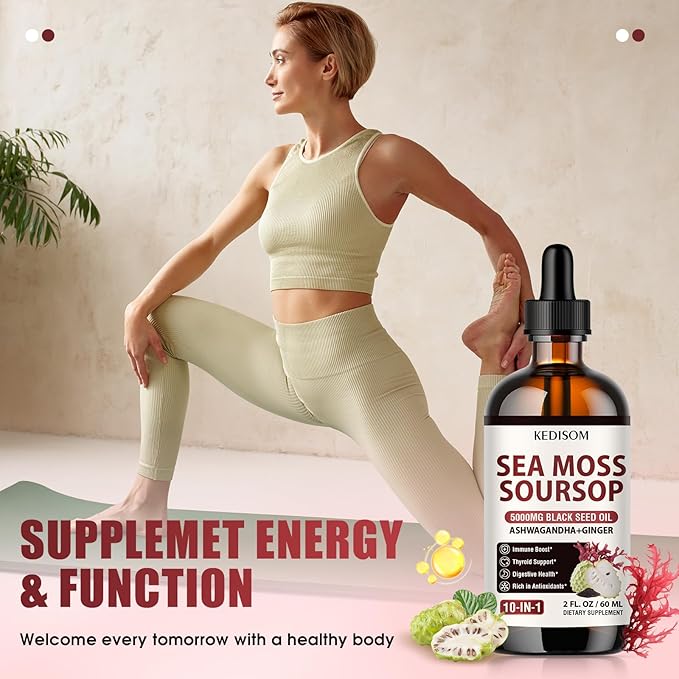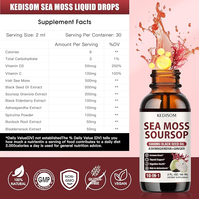 - NATURAL SEA MOSS SUPPLEMENT: Made with irish sea moss, ashwagandha and natural ingredients, sea moss soursop liquid drops is vegan-friendly, non-GMO, and gluten-free, ensuring a clean, high-quality formula to support a healthier, more balanced lifestyle