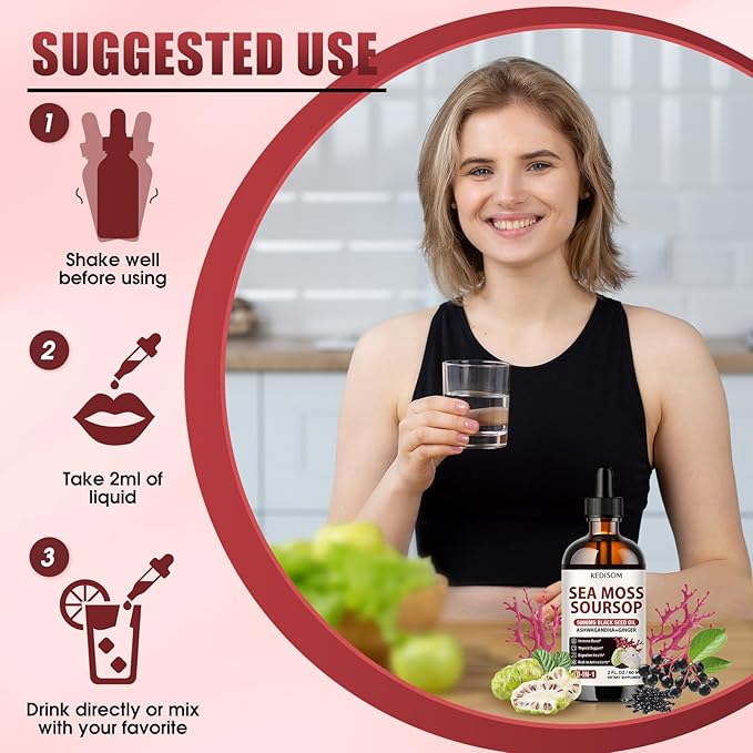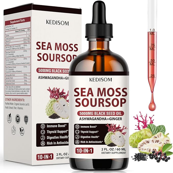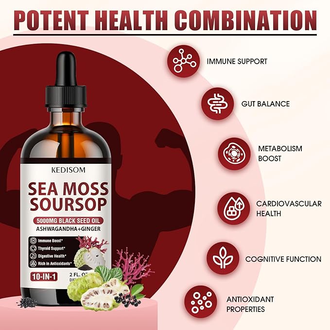 - SOURSOP SEA MOSS LIQUID DROPS: Infused with natural extract for bioavailability and ensure fast absorption, soursop drop seamoss supplement benefits the body including thyroid support, antioxidant protection, energy boost, skin health and overall wellness