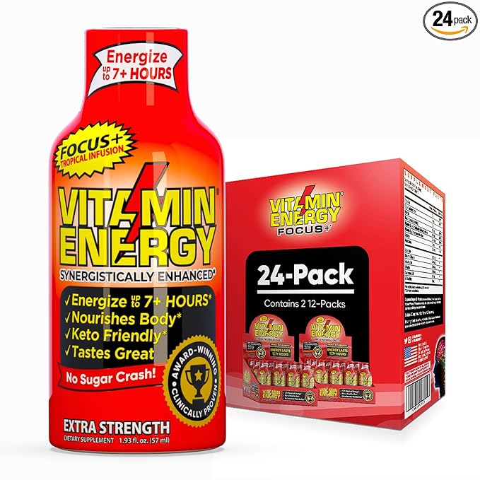 Vitamin Energy Focus+ Extra Strength Daily Energy Shot – Tropical Infusion – 260mg Natural Caffeine, 100% DV B-Vitamins – Focus & Productivity Support – Zero Sugar, Vegan, Kosher – 1.93 fl oz, 24-Pack