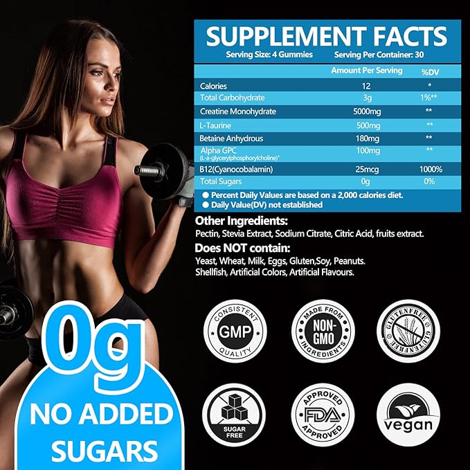 - SCIENTIFIC FORMULA: Our creatine monohydrate gummies are scientifically formulated to achieve maximum efficacy. Each serving contains 5000g, with 500mg L-taurine and 25mcg vitamin B12 added to maximize muscle strength and energy.