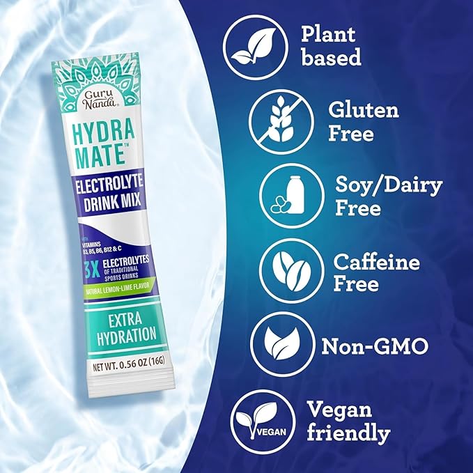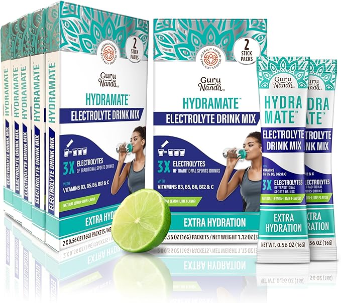 GuruNanda Hydramate Hydration Support Drink Mix - Electrolyte Powder Packets for Dehydration, Exercise & Energy - No Added Sweeteners, Non-GMO, Natural Lemon Lime Flavor - 12 Count (0.56 oz Each)