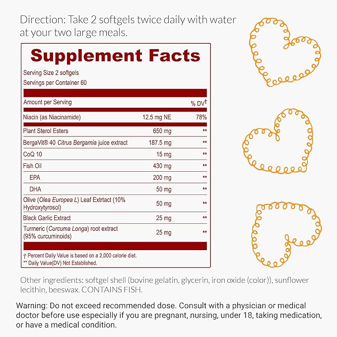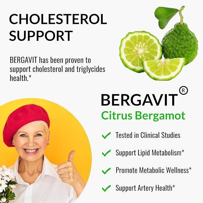 - Citrus Bergamot Supplement: This supplement contains vital nutrients such as BERGAVIT citrus bergamot extract, plant sterols, CoQ10, fish oil omega-3, turmeric curcuminoids, olive leaf and garlic extract.