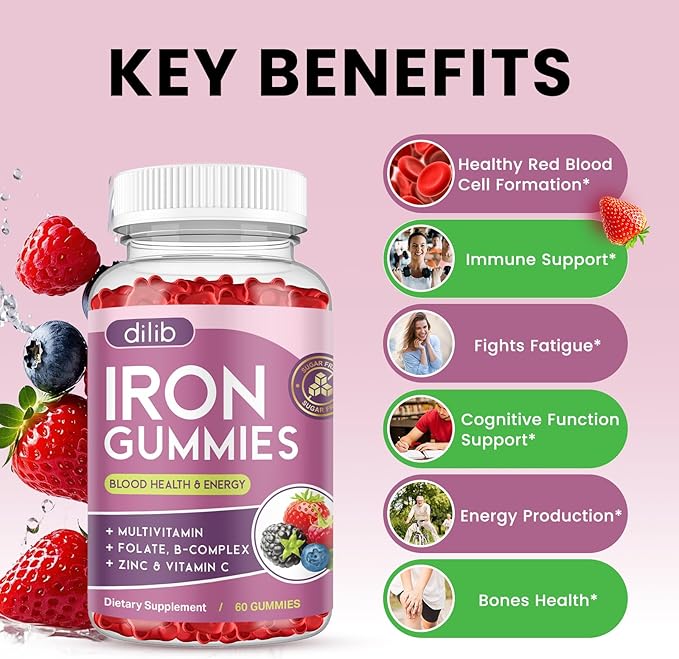 - BOOST YOUR IRON LEVELS NATURALLY: Dilib iron supplement gummies combine essential vitamins and minerals to provide a delicious and easy way to support your daily iron intake. Prevent iron deficiency, promote healthy blood production, and boost energy levels without the discomfort of traditional supplements. These iron gummies effectively increase iron levels and sustain natural energy levels, eliminating fatigue and weakness to keep you energized throughout the day