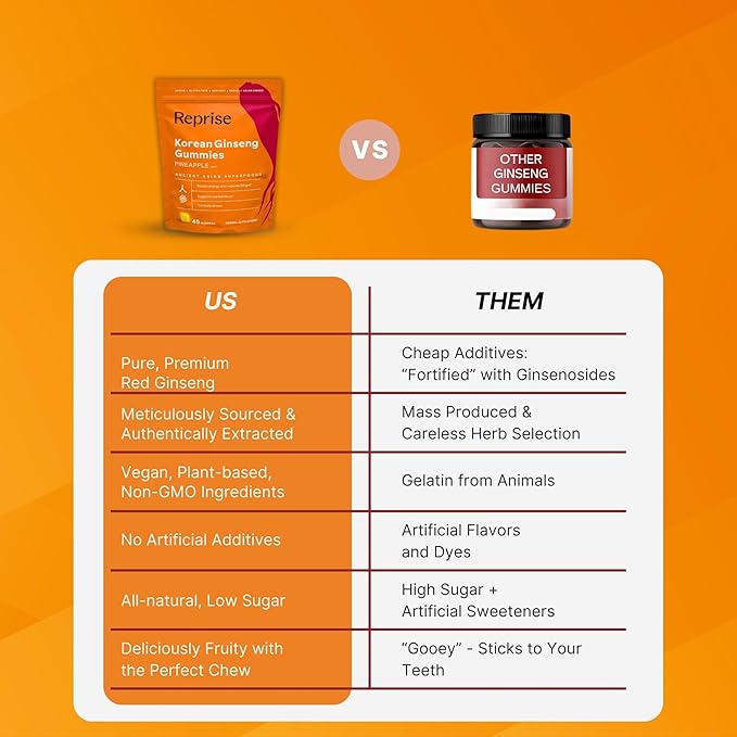 • LOW SUGAR: Only 3g of Natural Sugar: Plant-based, Vegan, Non-GMO, Gluten-free & Gelatin-free: each Reprise Korean Red Panax Ginseng gummy contains 3g of sugar - that’s the equivalent to 1/5 of a banana.