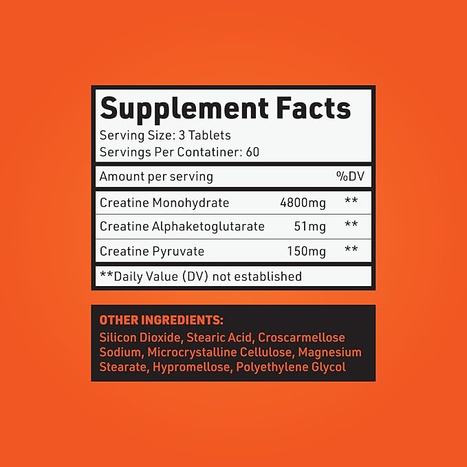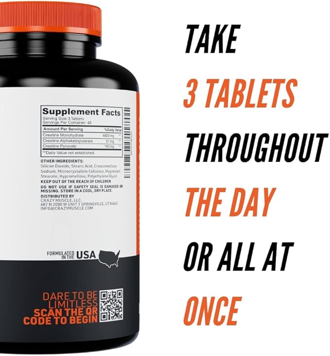 Crazy Muscle Creatine Monohydrate Pills - Premium 3 Type 5g Creatine Pills - Pre/PostWorkout & Keto Energy Builder - Easy-to-Take Three-Atine Pills for Optimum Performance Men Women - 180 Tablets