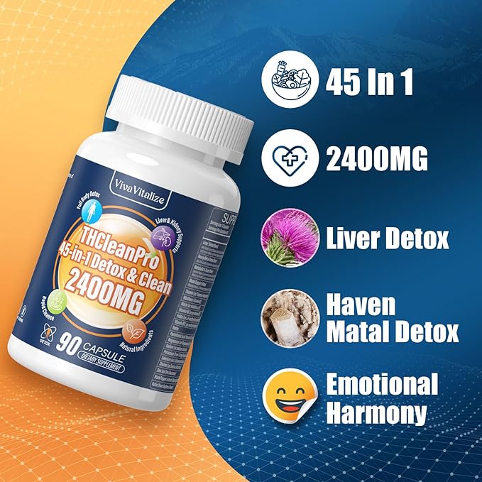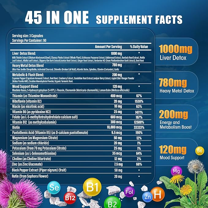 - 45-IN-1 COMPREHENSIVE LIVER DETOX: 100% All natural and effective ingredients:Liver Detox Blend (e.g., milk thistle detox, artichoke, and burdock root): Supports liver health, aids detoxification, and improves digestion.Heavy Metal Detox Blend for Adults (zeolite, chlorella, activated charcoal):Removes heavy metals and toxins, promoting a cleaner system.Metabolic & Flush Blend (cayenne, apple cider vinegar): Boosts metabolism, aids fat burn, and supports circulation.Mood Support Blend (5-HTP, L-theanine): Reduces stress, enhances mood, and promotes mental clarity.Essential Vitamins & Minerals (B vitamins, zinc, selenium, magnesium): Increases energy, strengthens immunity.