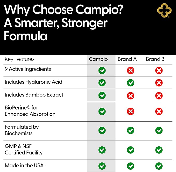 - SUPPORT FOR AN ACTIVE LIFESTYLE: Whether you're looking to support your joint health as you age or simply want to stay active and comfortable, Campio's Joint Support Supplement is designed to help you maintain healthy joints and cartilage.
