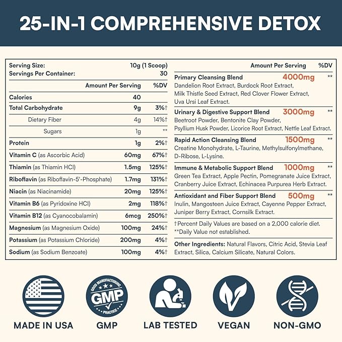 - 【Actually 10,000 mg Per Serving】: Unlike other detox supplements with exaggerated dosage claims, our ultra-potent detox powder supplement provides a true 10,000 mg per serving. Backed by a unique 25-in-1 formula, it effectively supports body cleanse, detox, and repair processes for real toxin removal results.